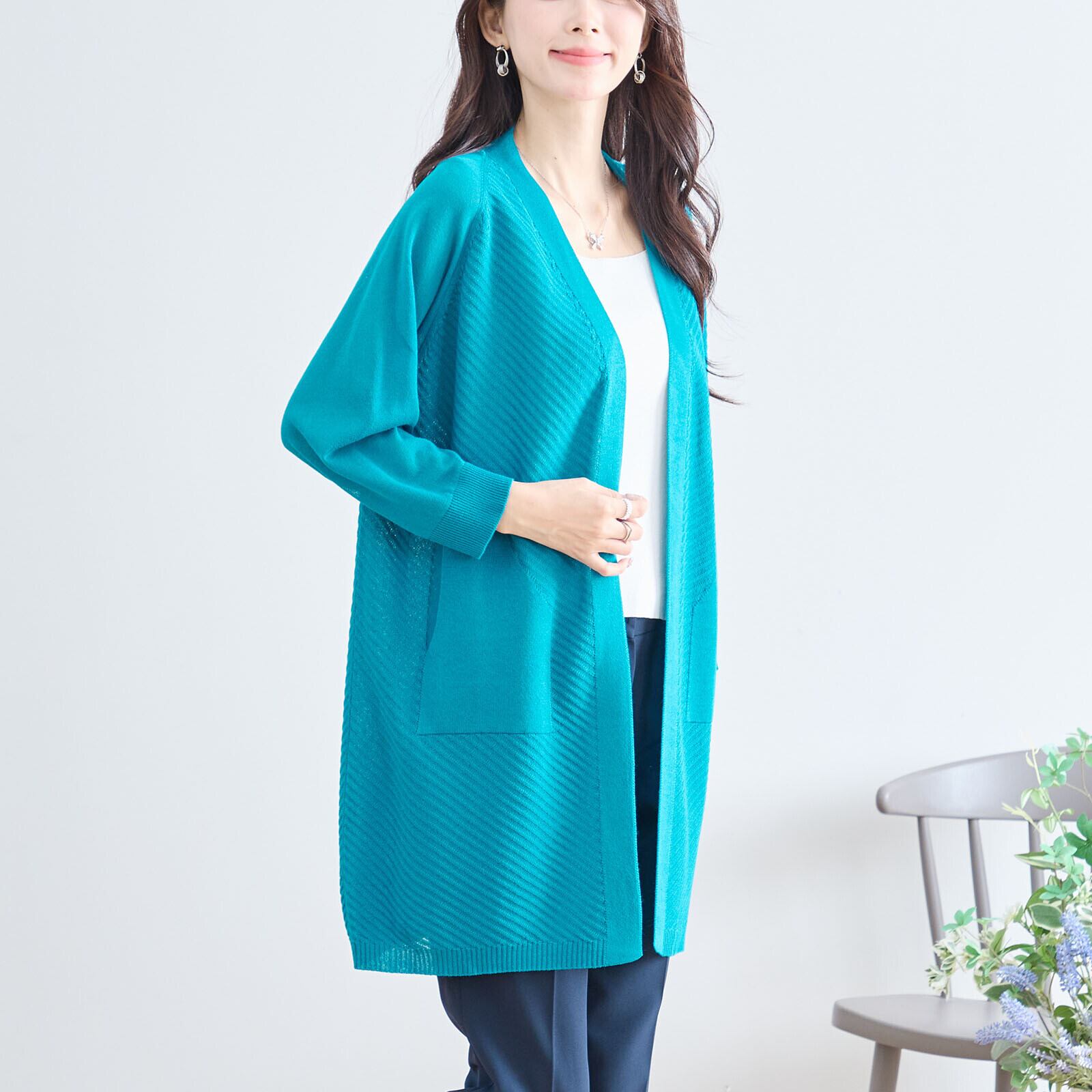 涼しげなサマーニット素材を使用した、M〜Lサイズでゆったり着られるカーディガン。シンプルながらもお洒落なデザインで、肌触りが良く軽やかな着心地が魅力です。フロントの開き具合や袖口のデザインで、こなれ感のあるスタイリングが楽しめる一品です。これからの季節にぴったりなアイテムで、さまざまなコーディネートに活躍します♪
