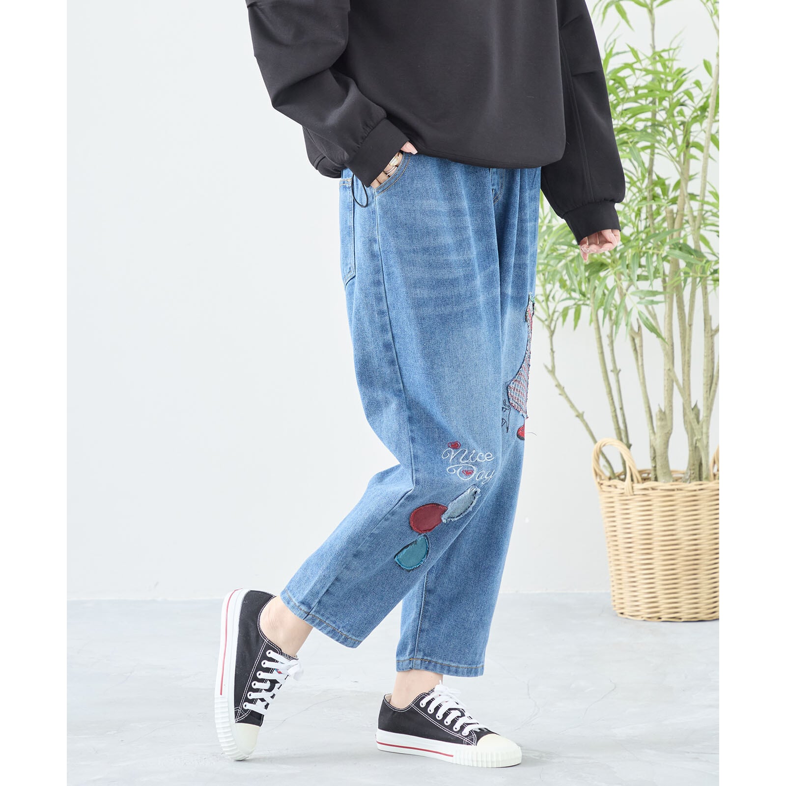 【M〜L】イラストワイドテーパーデニムパンツ(C35-190D)