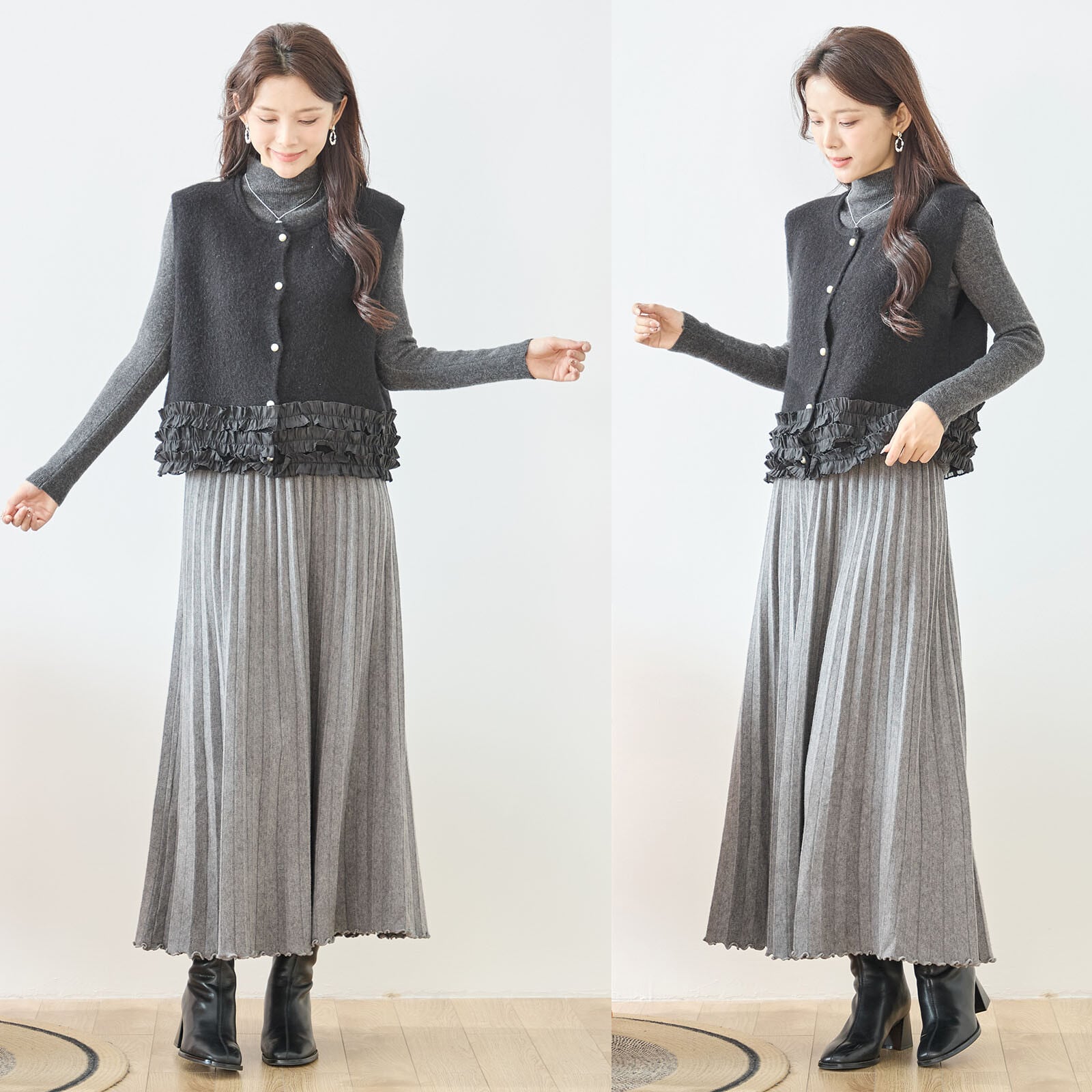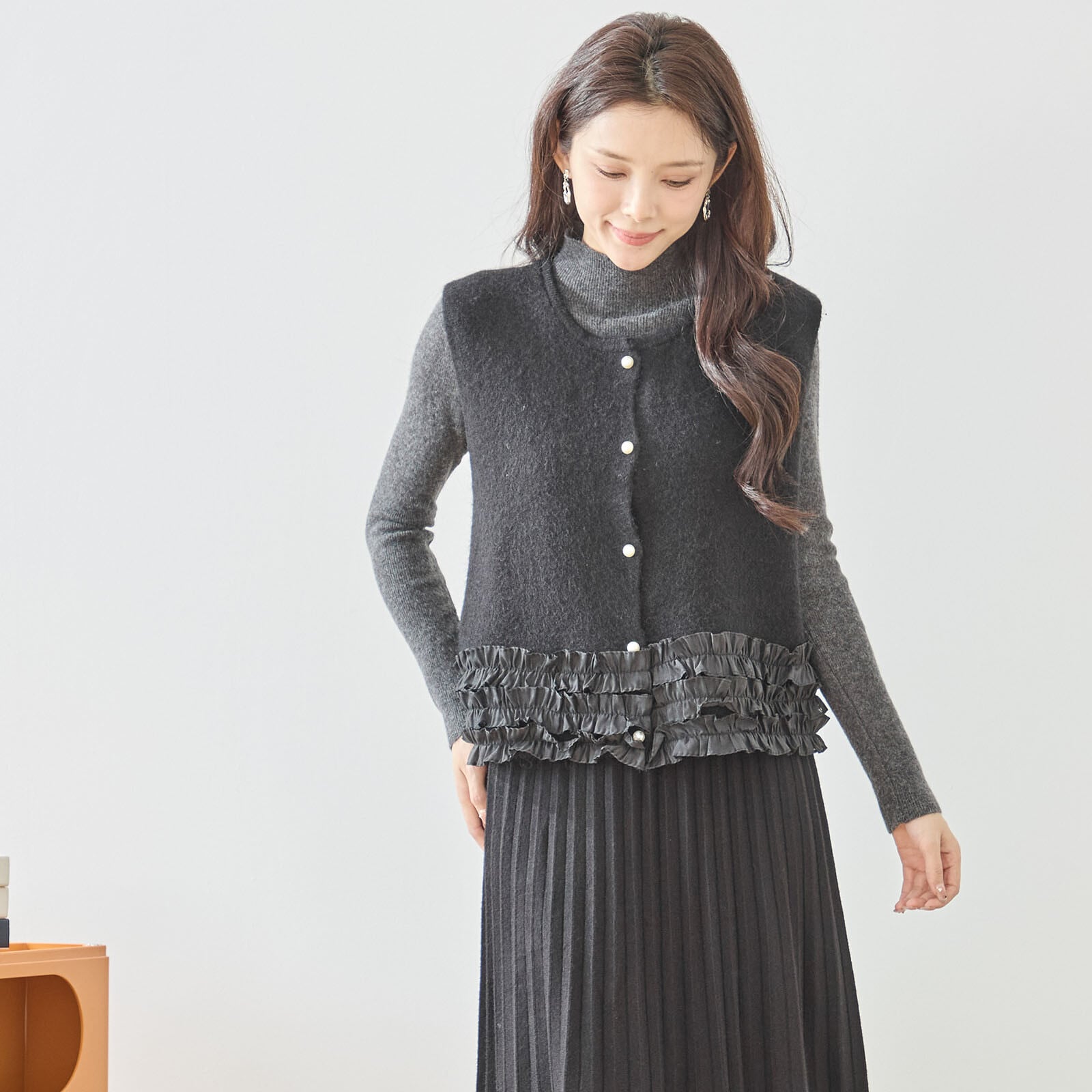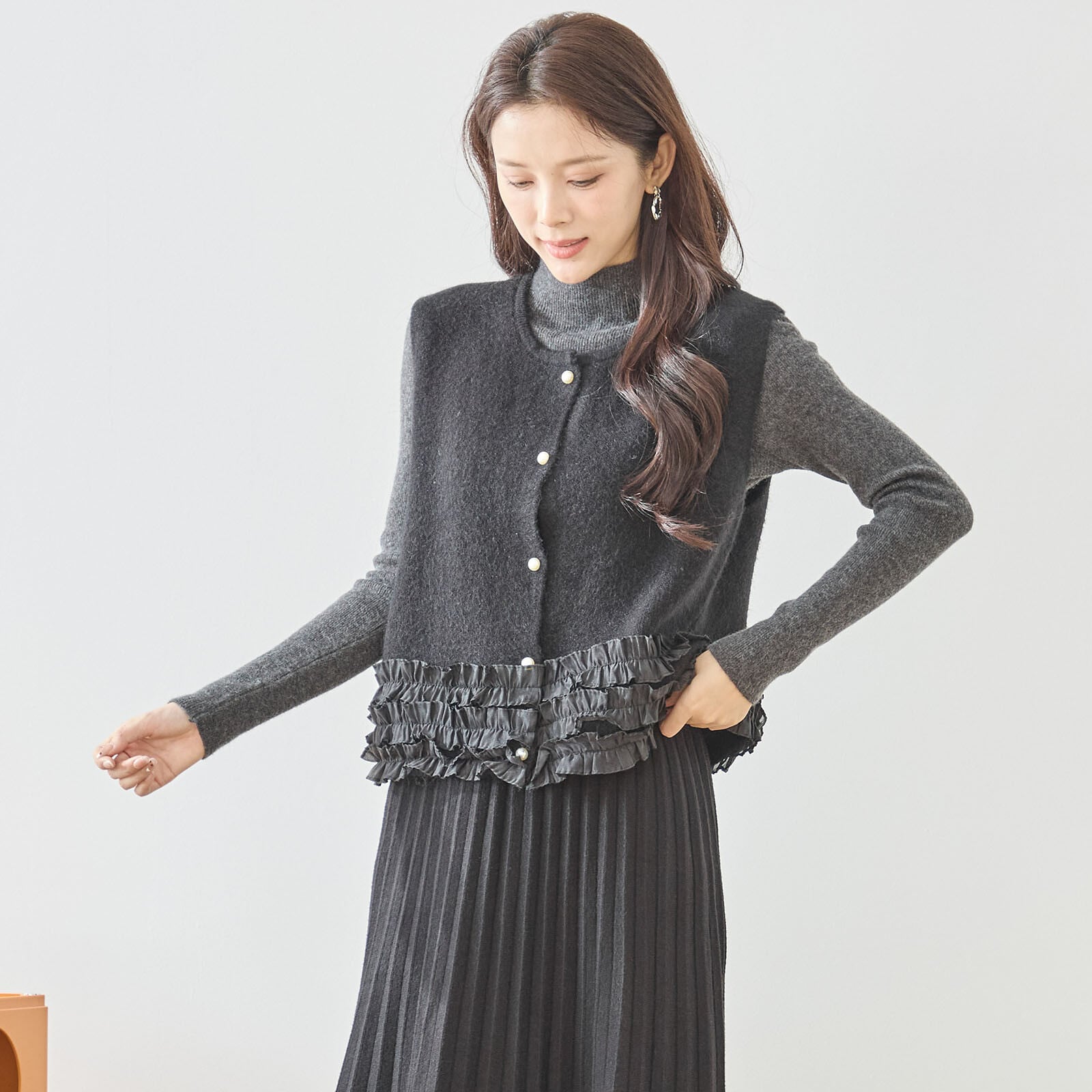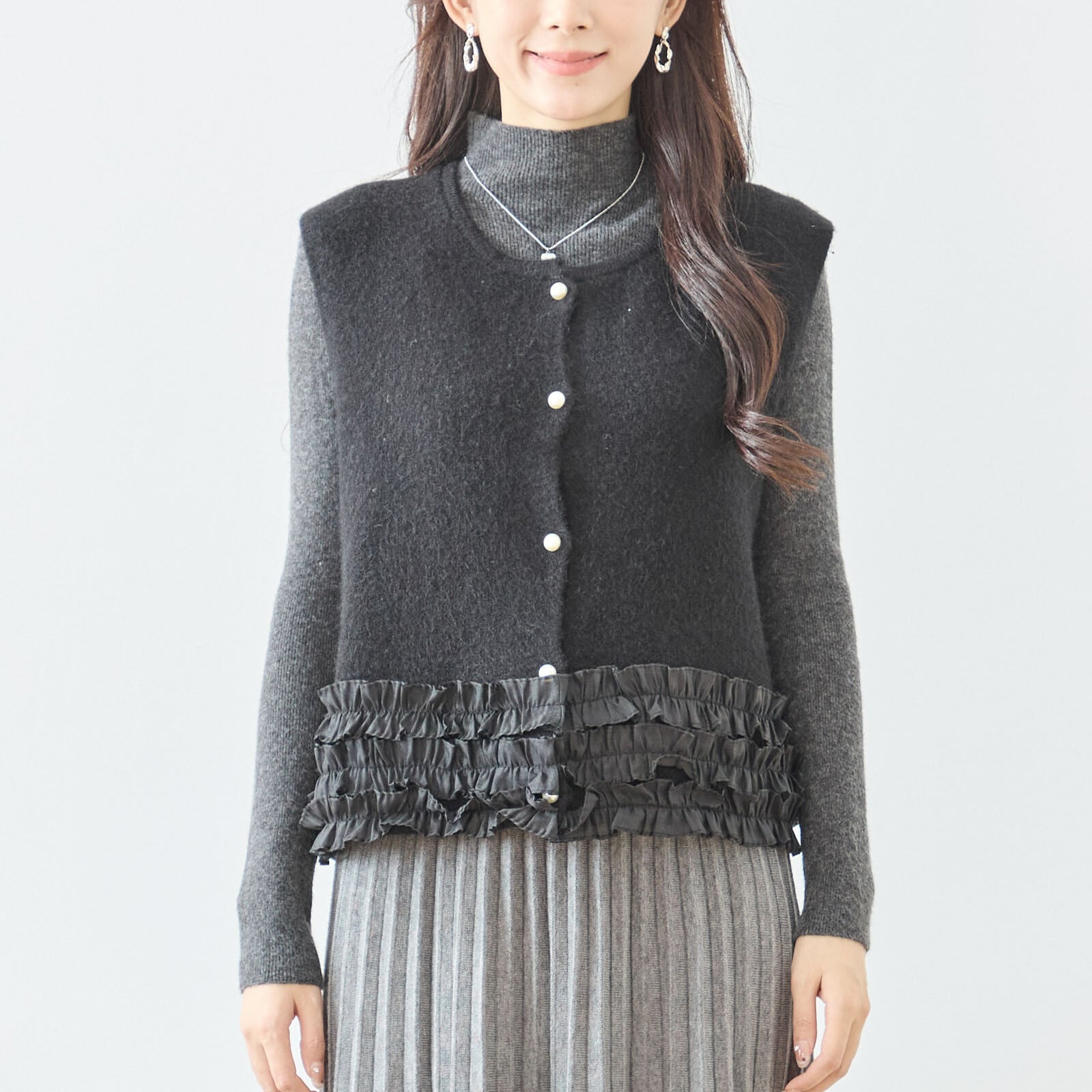 [Design]裾に重ねたフリルデザインがフェミニンな印象を与えるニットベスト。柔らかな風合いのニットに、軽やかなシフォンフリルをあしらい、シンプルなトップスに合わせるだけで華やかさをプラスします。前開きのパール調ボタンが上品なアクセントになり、カジュアルにもきれいめにも着回しやすい一枚です。