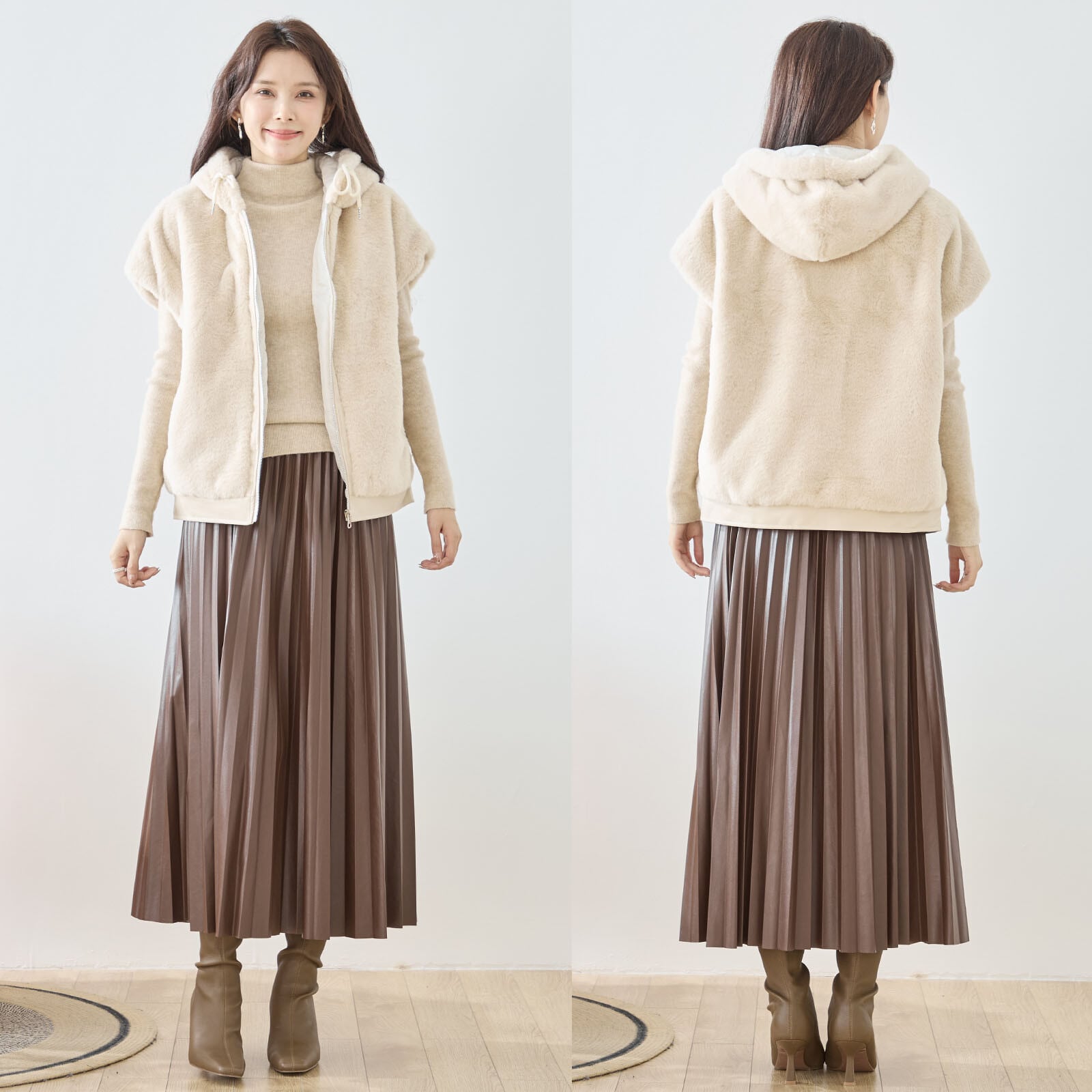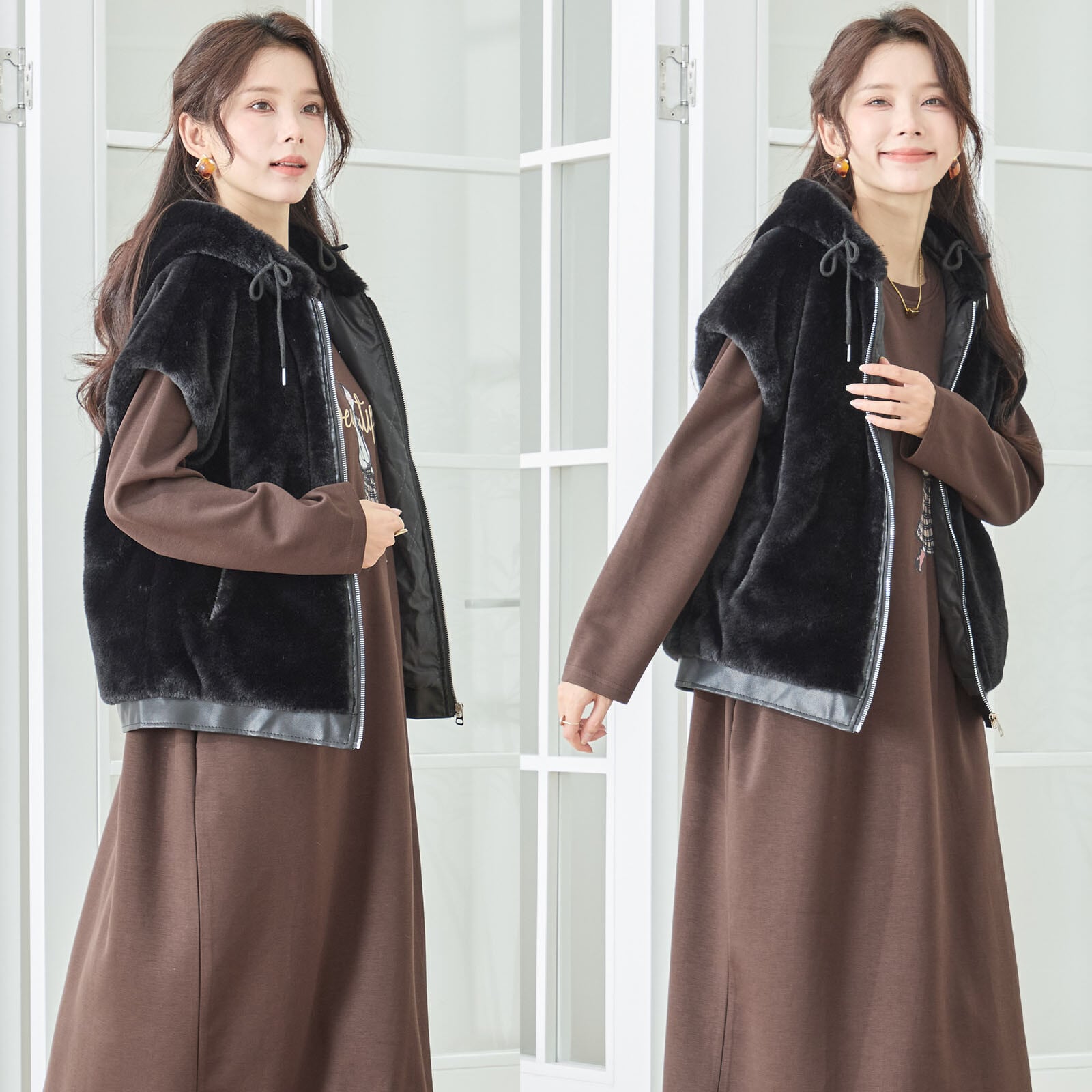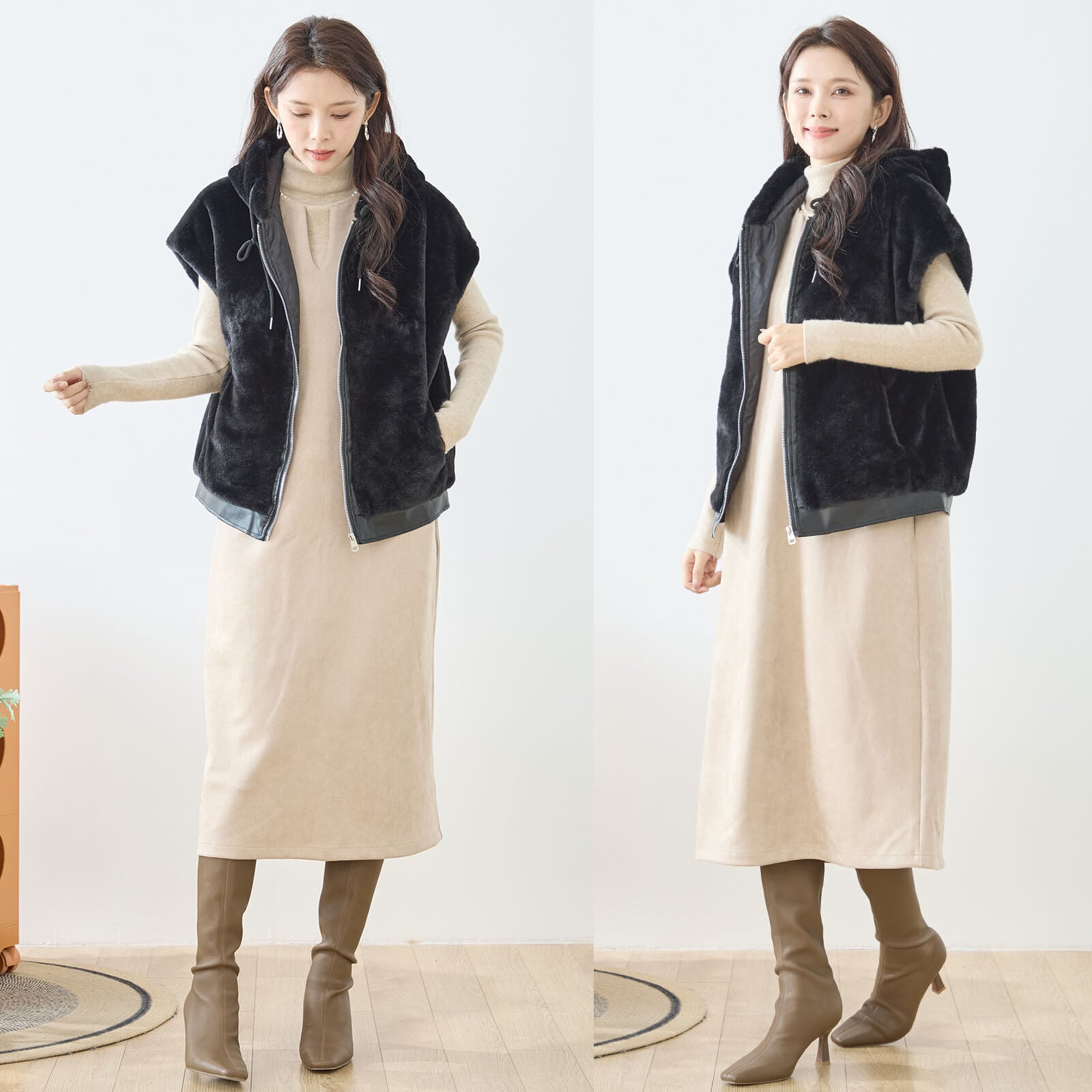 【M〜L】フード付きフェイクファーベスト(N32-085)