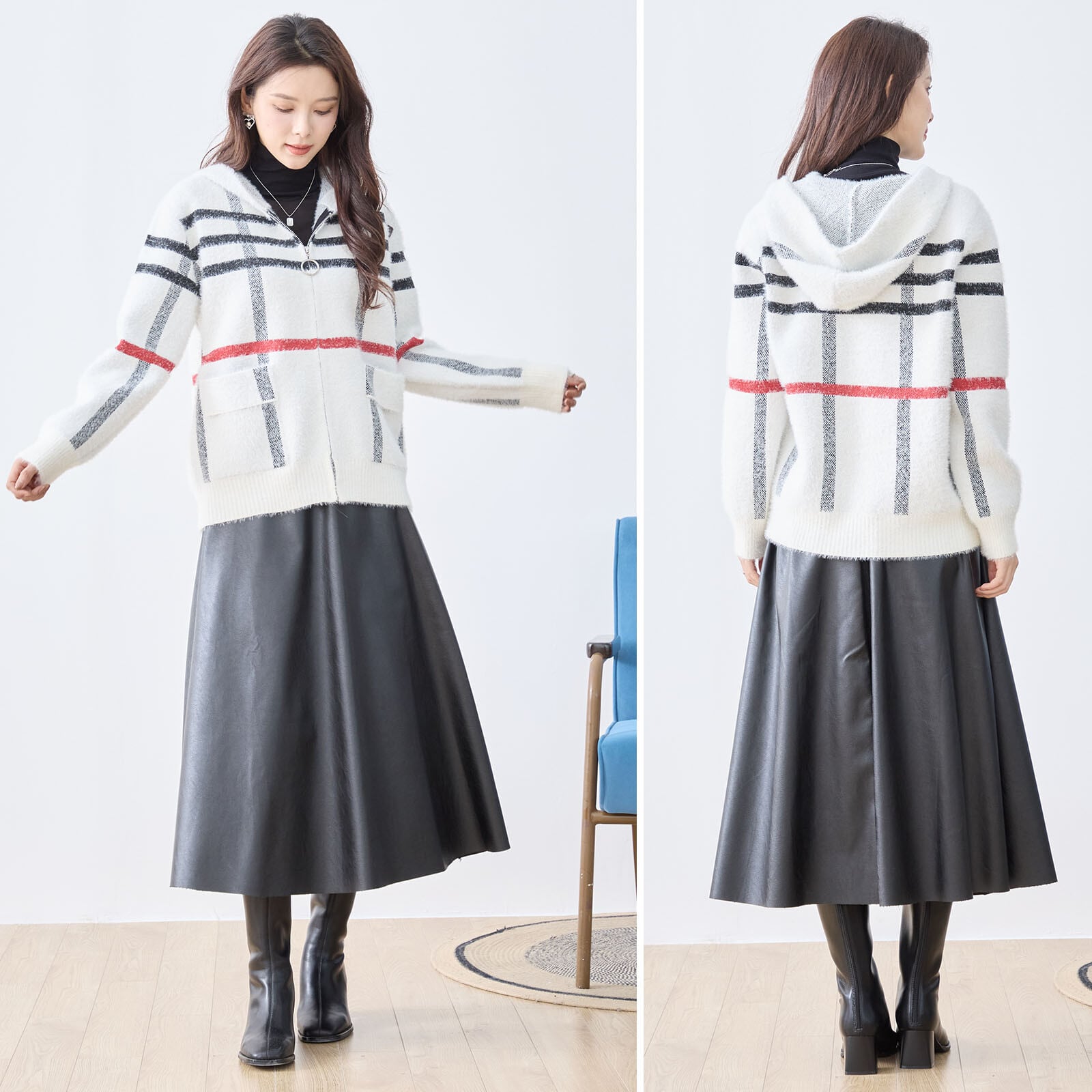 【M〜L】チェック柄フードデザインシャギーニットジャケット (R32-314B)