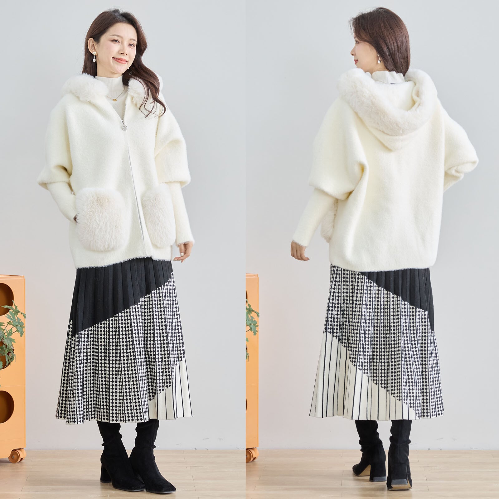 [Design]冬の装いに華やかさをプラスする、リッチなファーデザインが目を引くフードブルゾン。フードとポケットにあしらわれたフェイクファーが、上品さと可愛らしさを絶妙に融合。動きやすい設計で、暖かさもたっぷり確保。大人のデイリーカジュアルにぴったりの一着です。