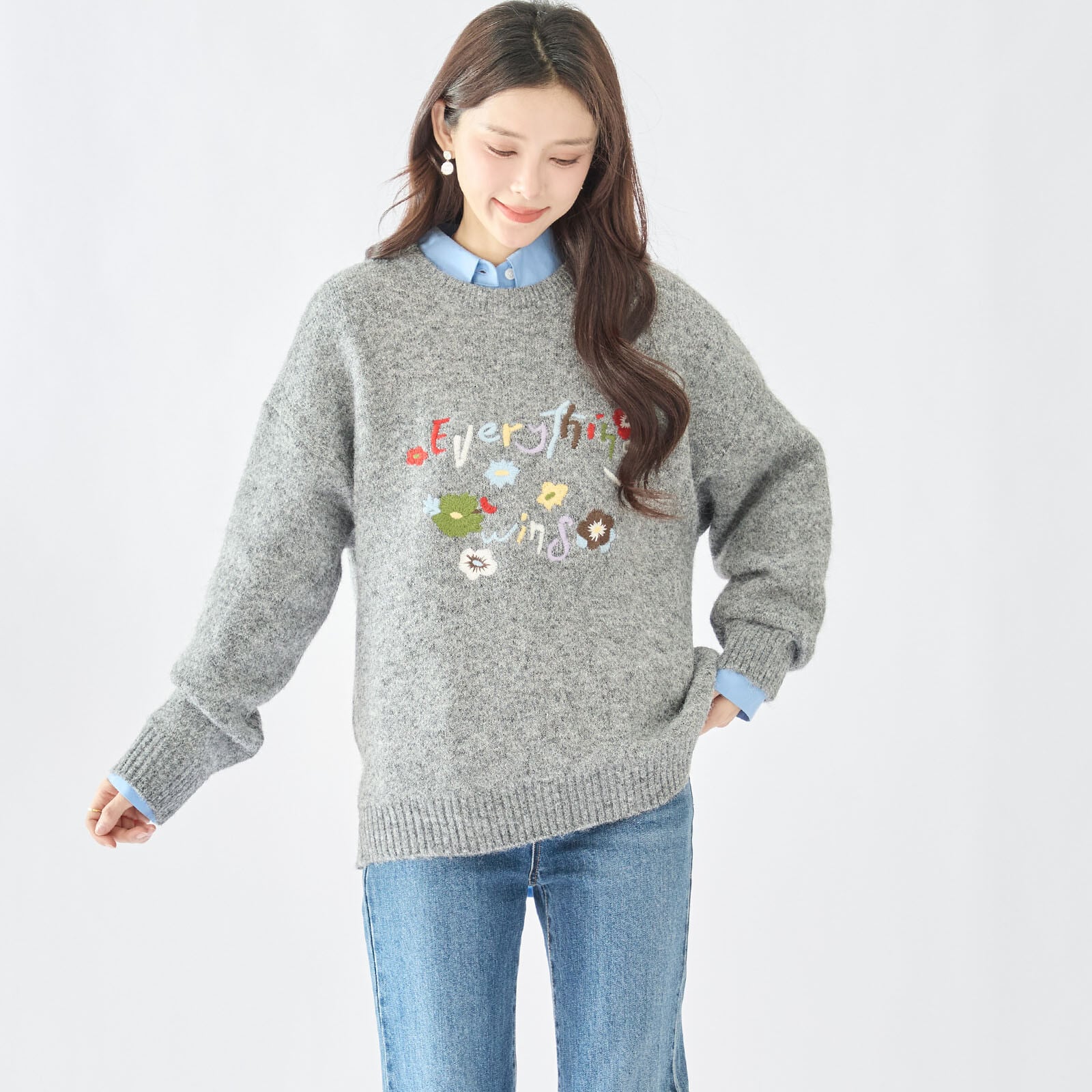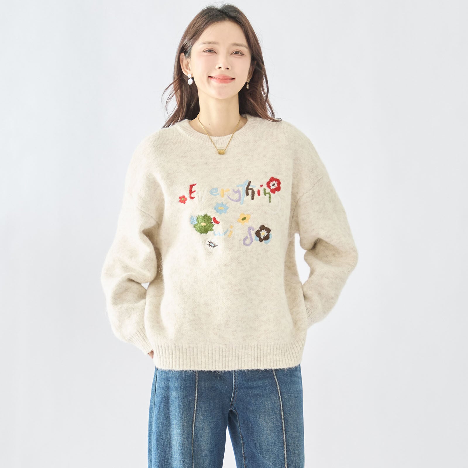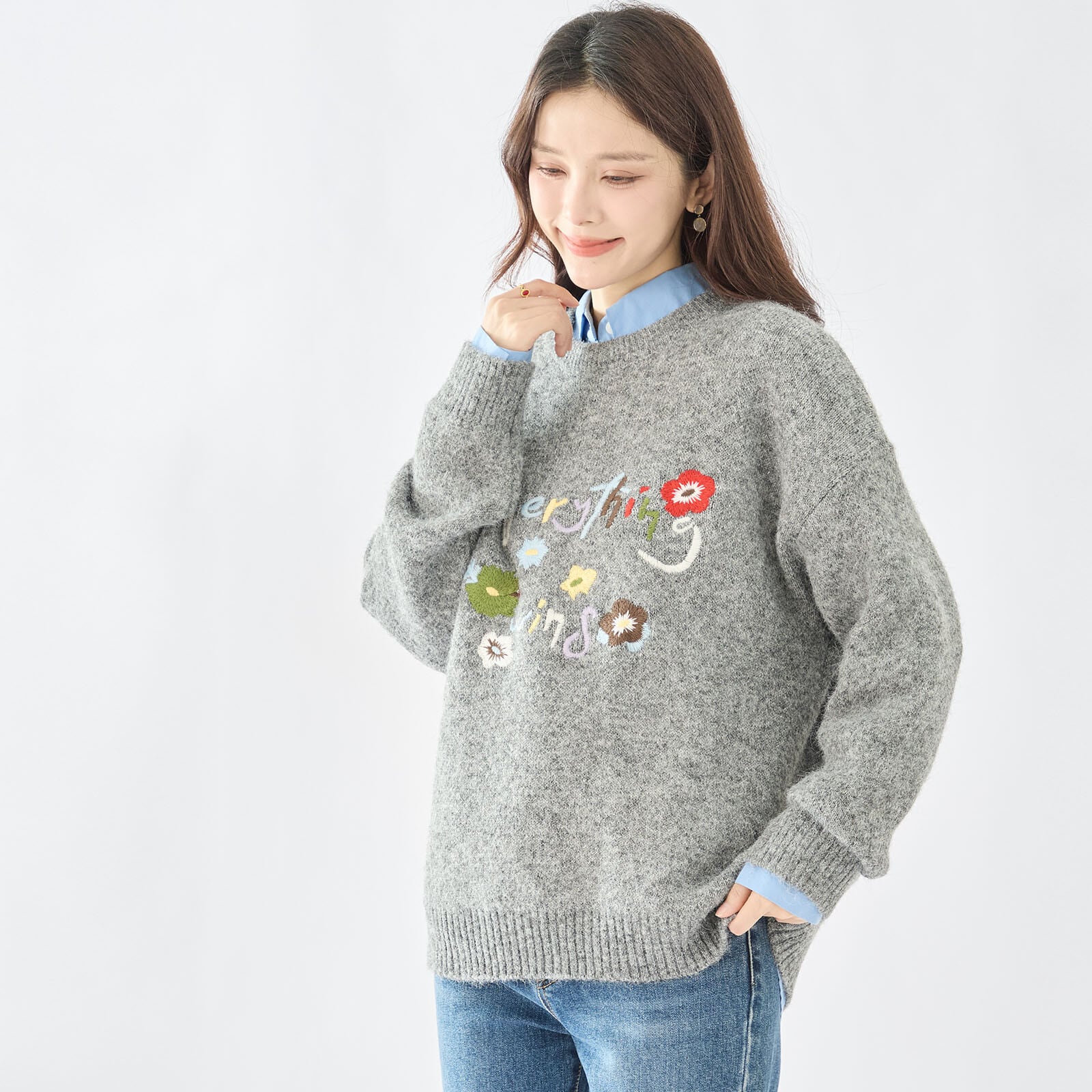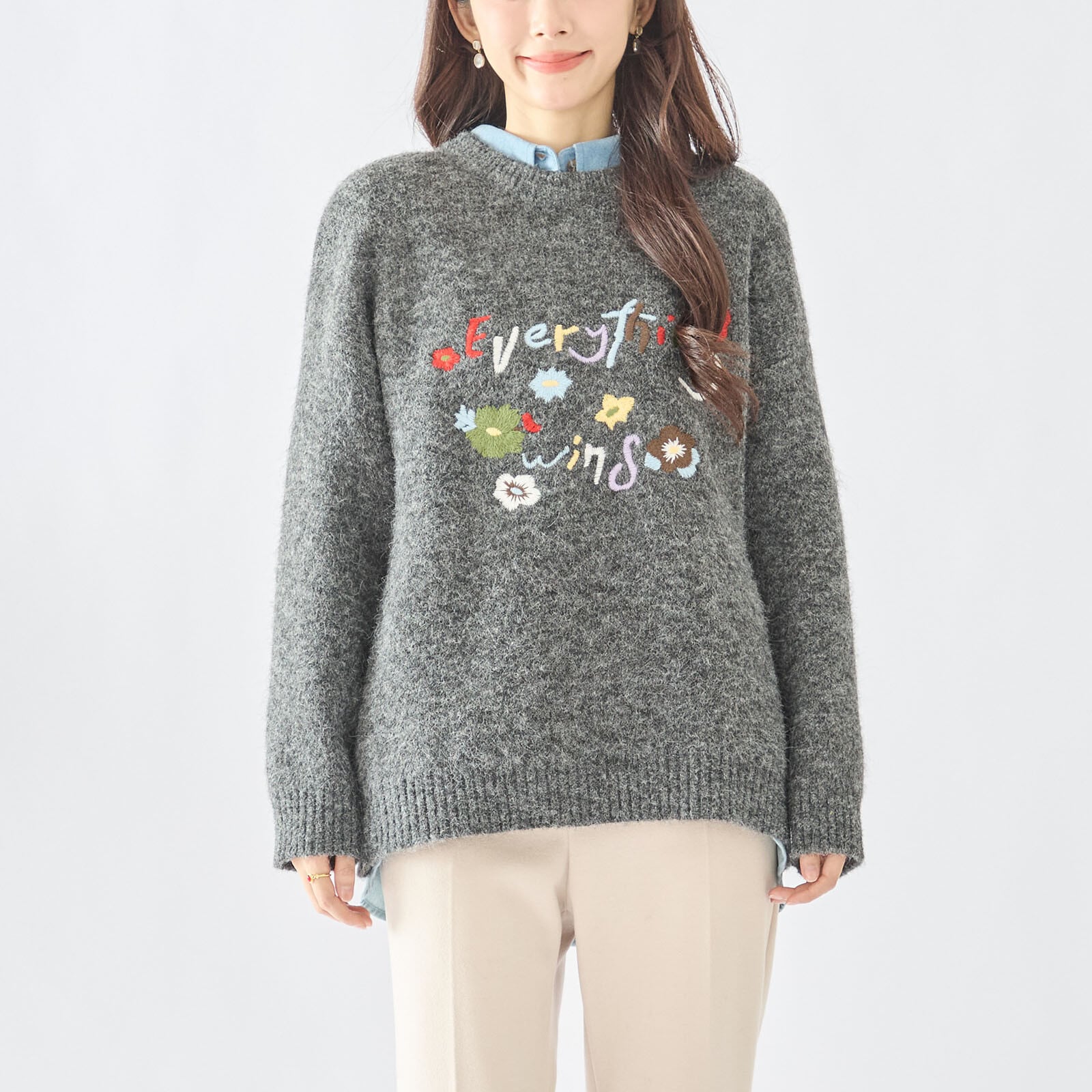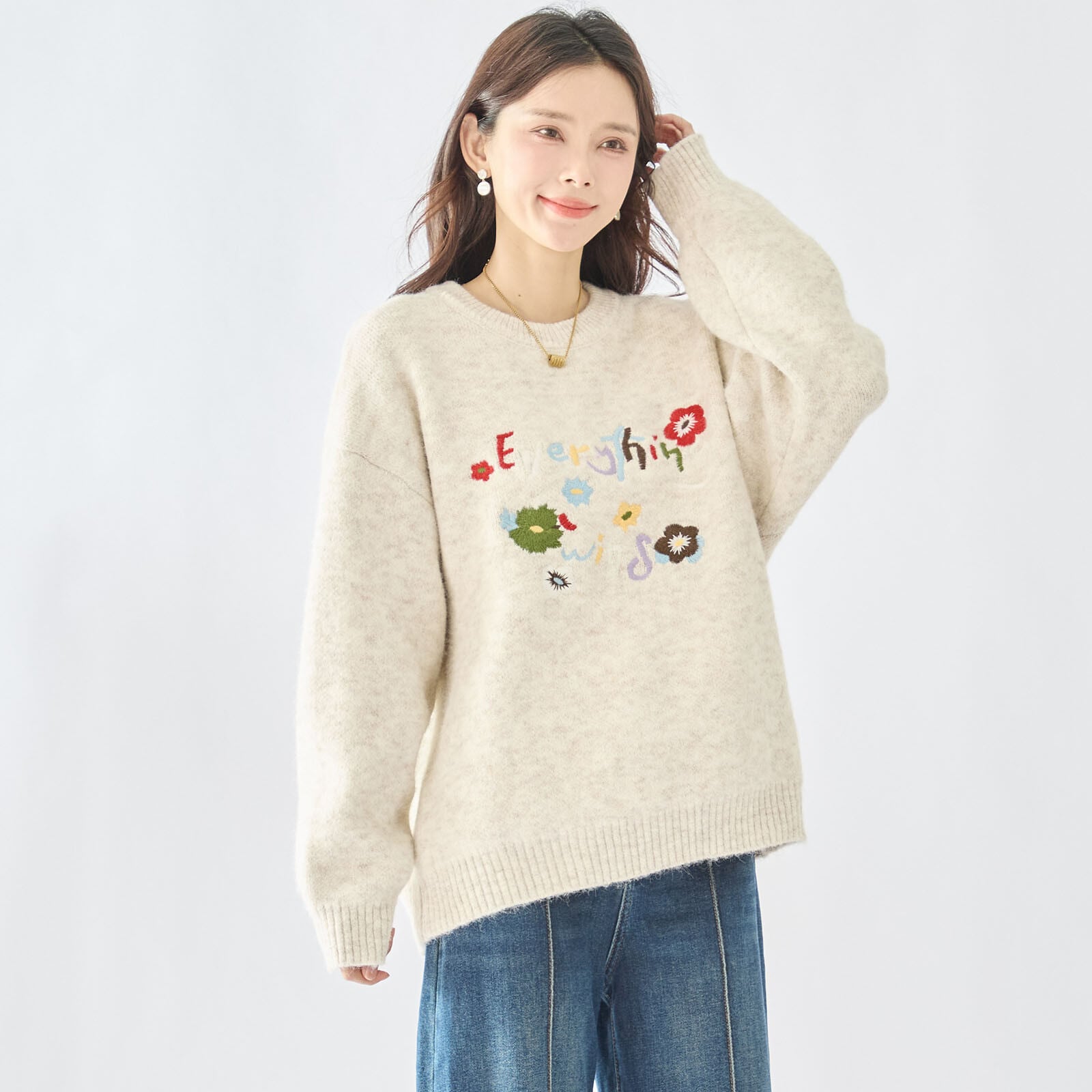 フロントに施されたカラフルな刺繍が、冬のスタイルをふわっと明るくしてくれる主役ニット。