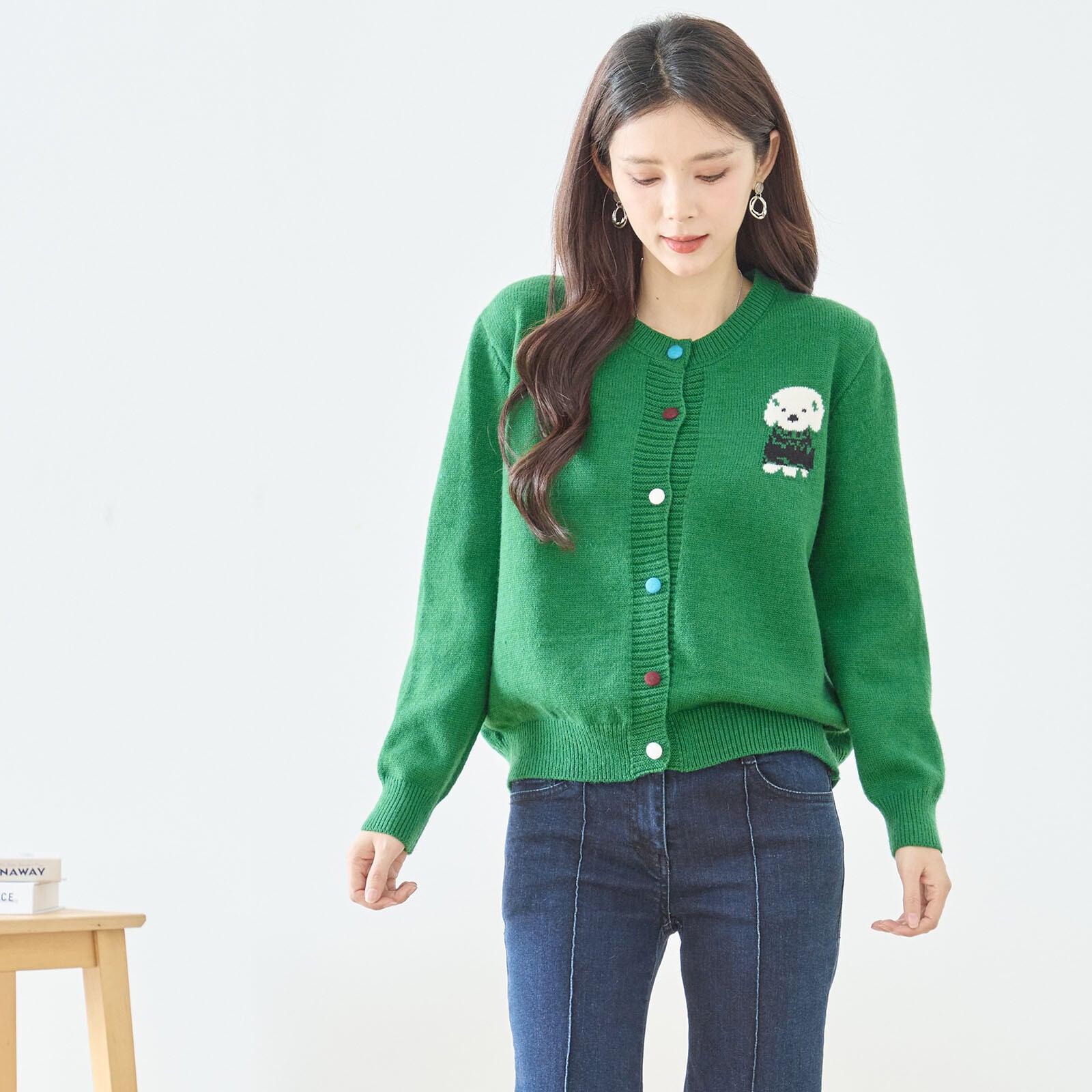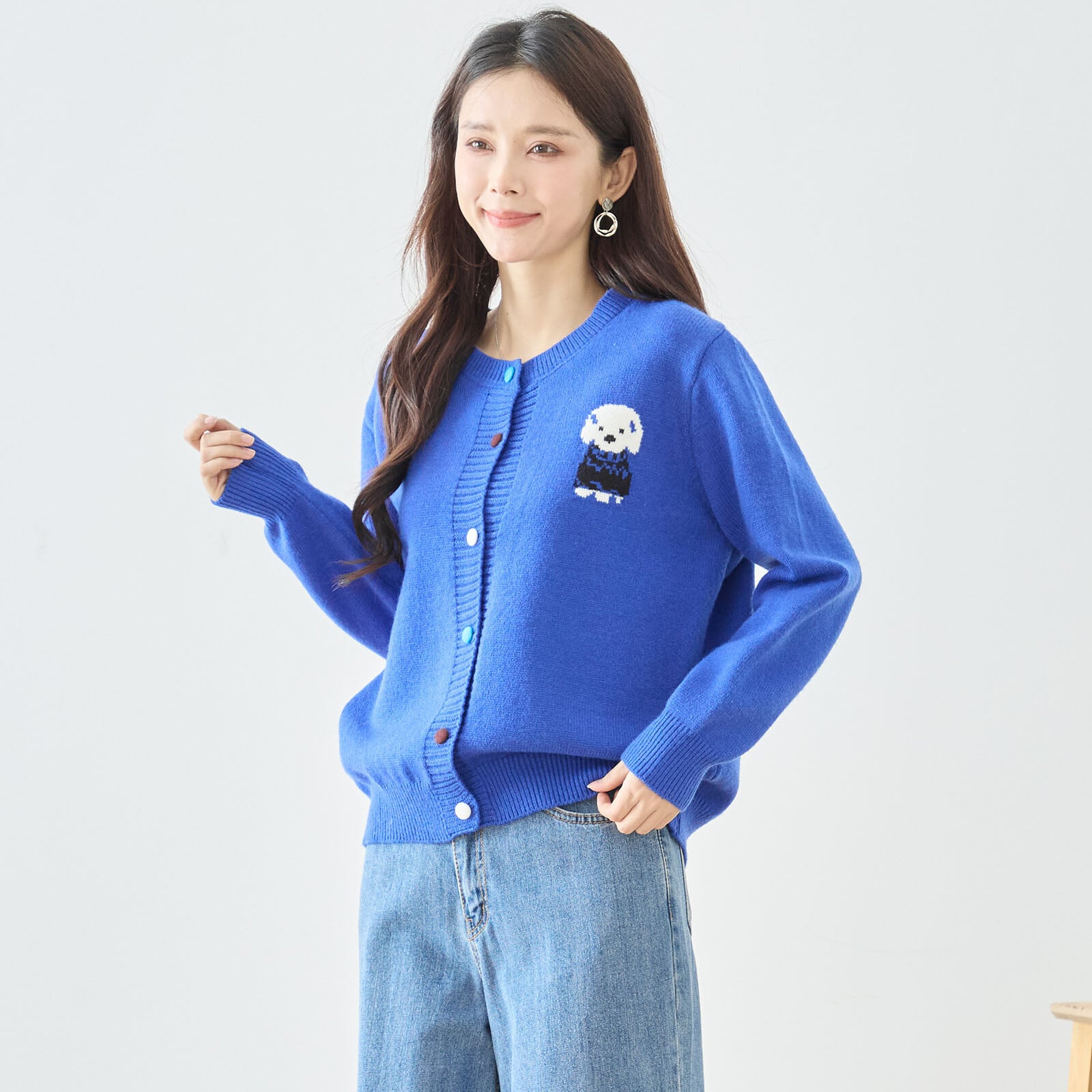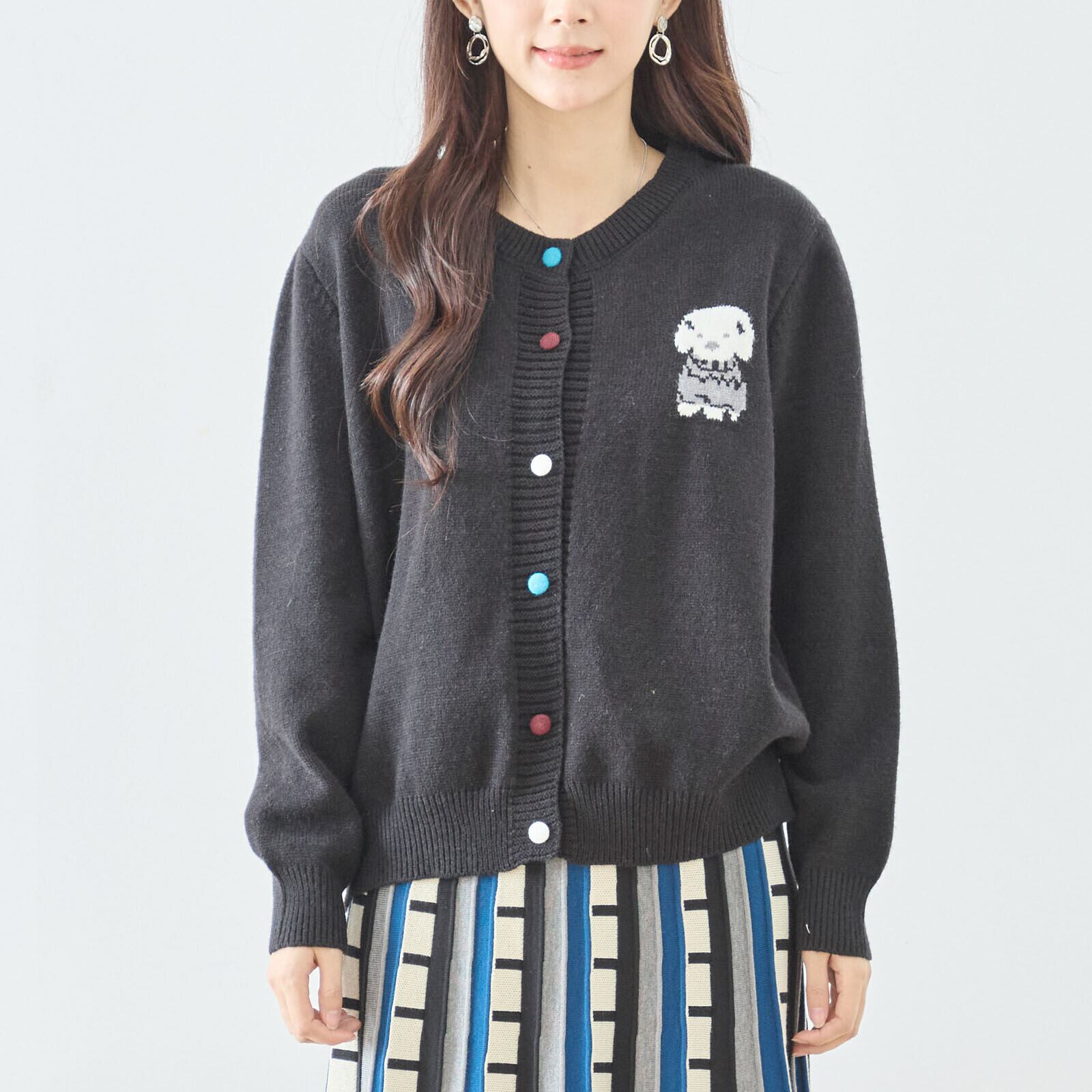 胸元にあしらった愛らしいドッグモチーフが目を惹く、遊び心たっぷりのニットカーディガン。シンプルなクルーネックデザインに、さりげない存在感のある刺繍をプラスすることで、大人可愛いスタイリングを叶えます。