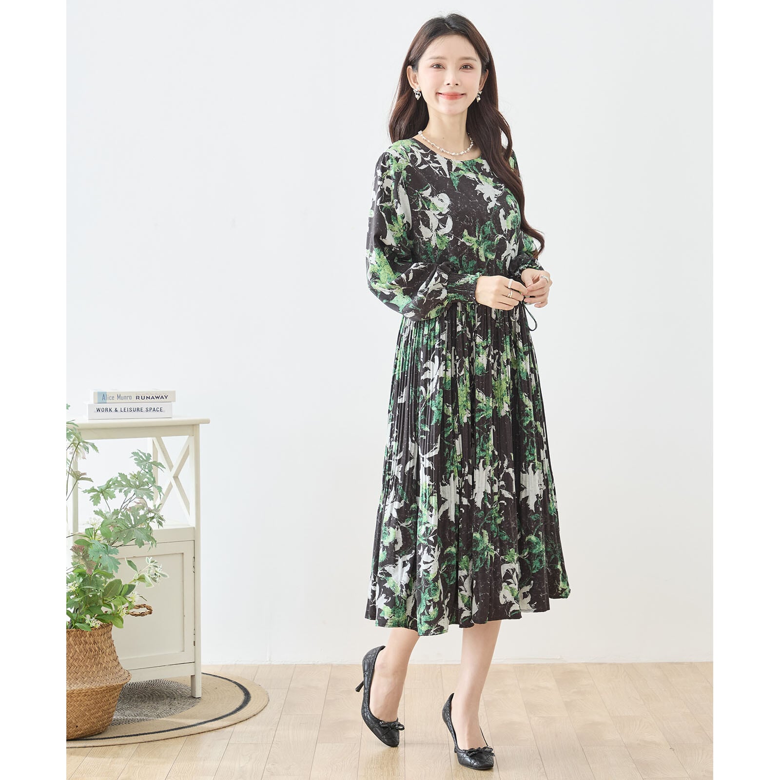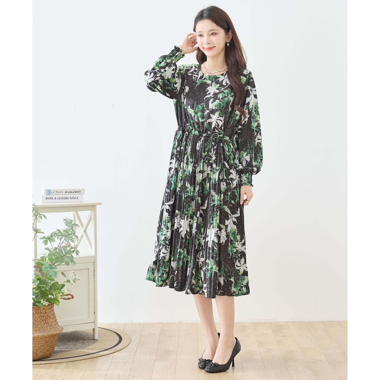 【L〜LL】ゆったりサイズ リーフ柄ワンピース(N82-476A)