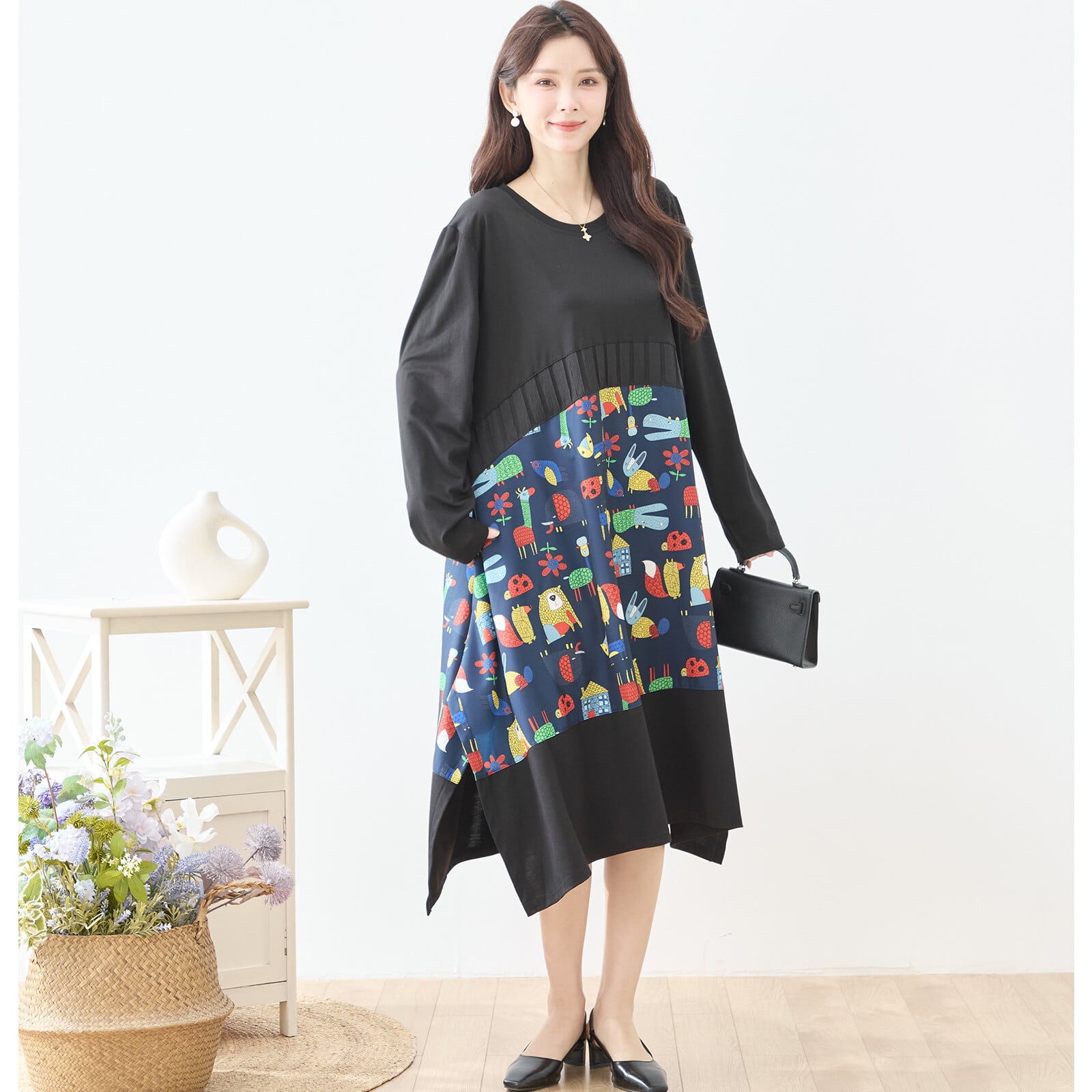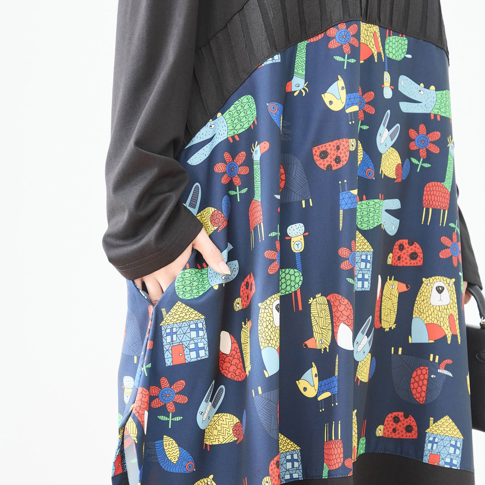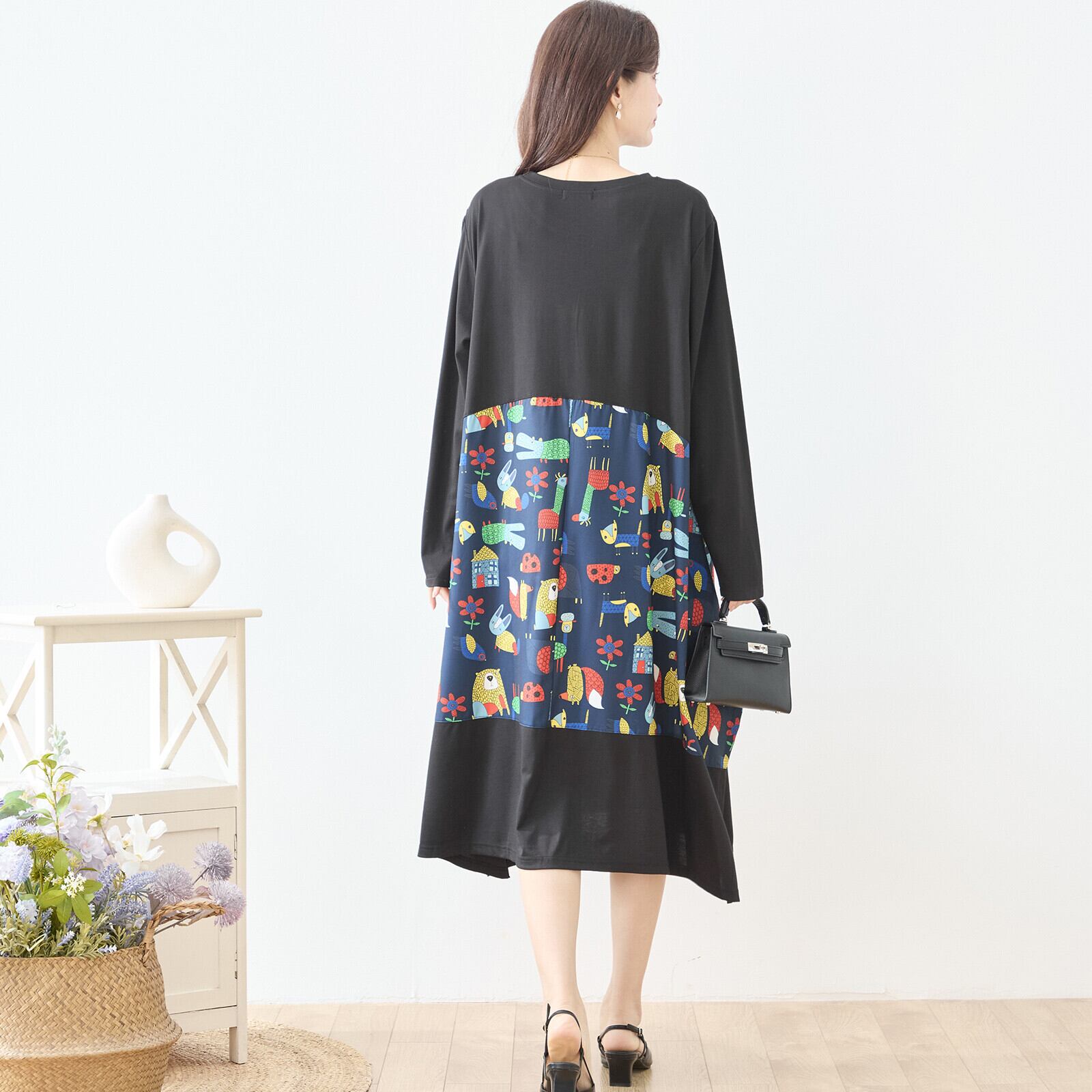 無地と遊び心あるアニマルプリントを切り替えた、存在感のあるデザインワンピース。上身頃はシンプルなカットソー素材で落ち着いた印象に仕上げ、ウエスト下から広がるカラフルなプリントがコーディネートに楽しさをプラスします。ゆったりとしたシルエットと長め丈で体型をさりげなくカバーしながら、1枚でスタイリングが完成する主役アイテムです。