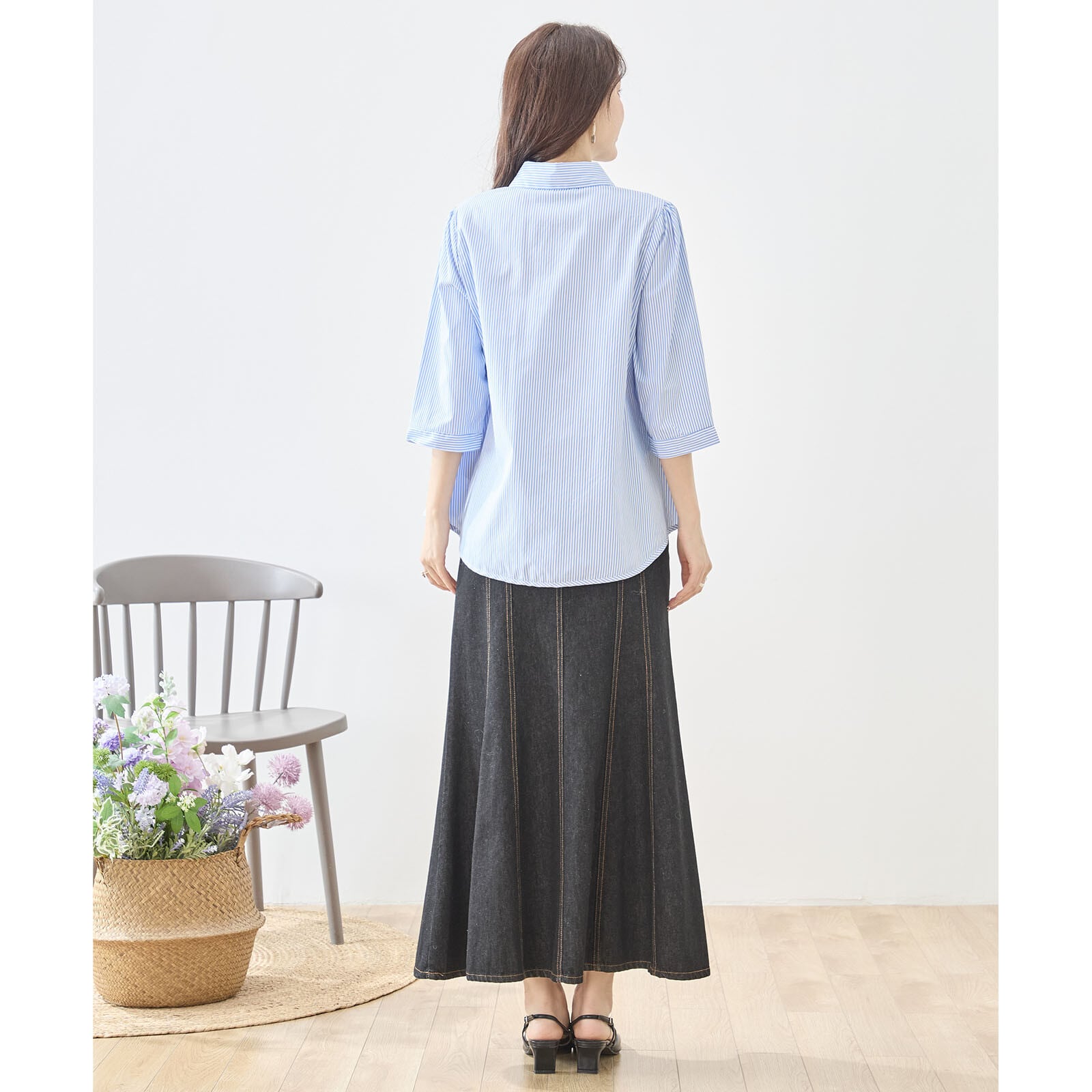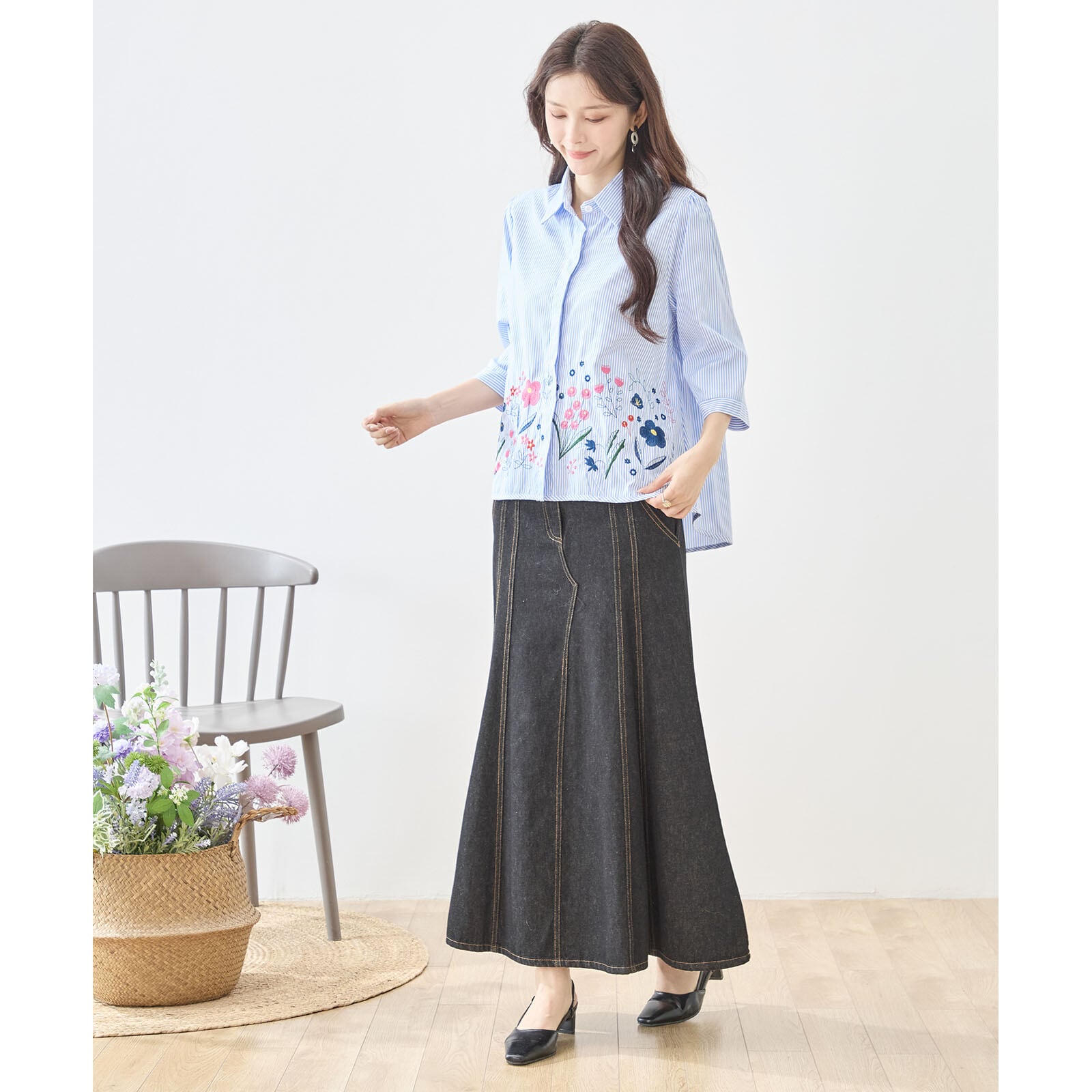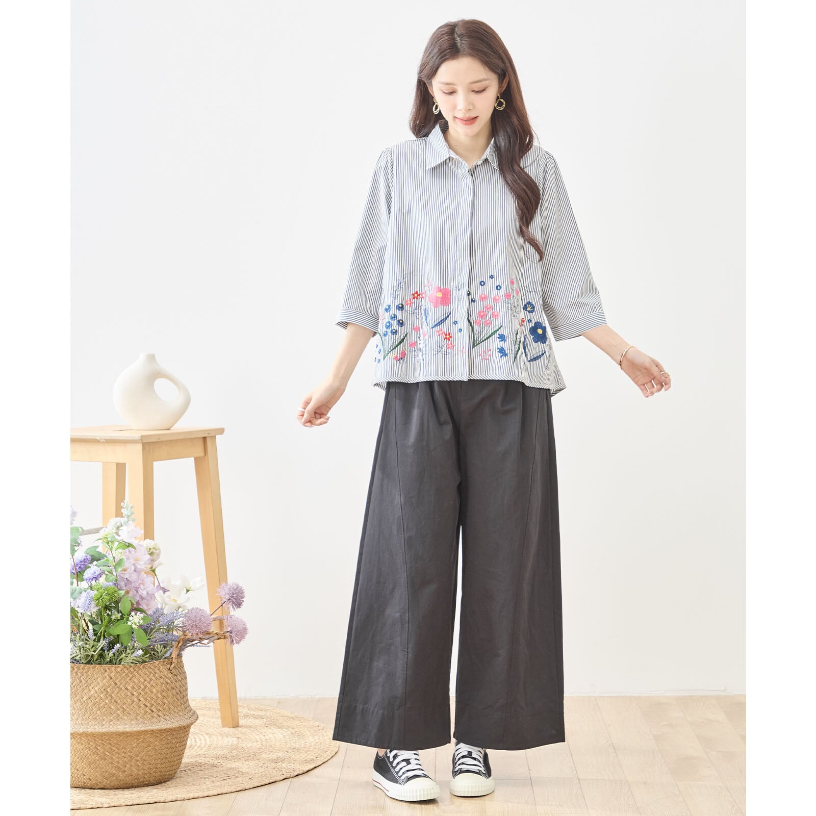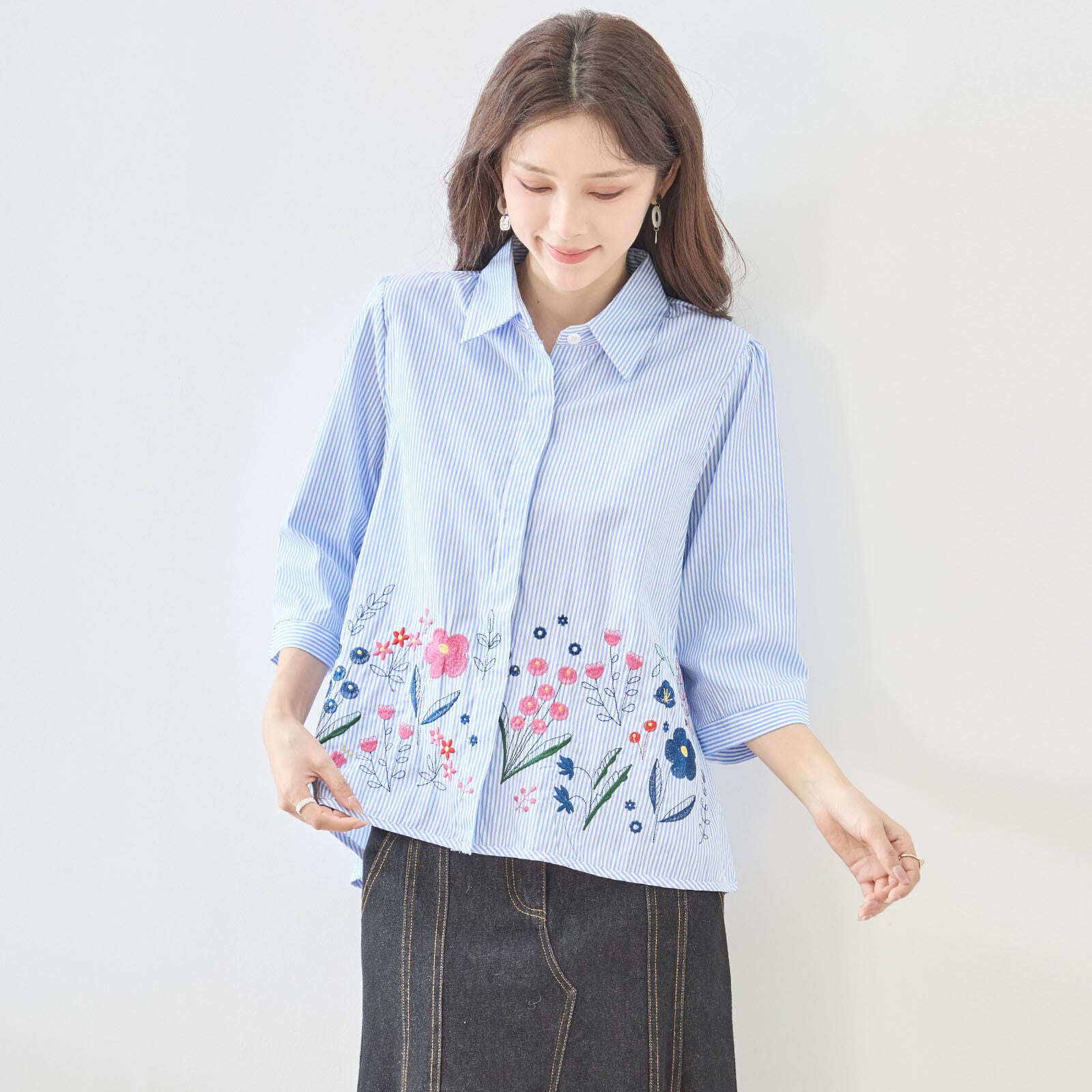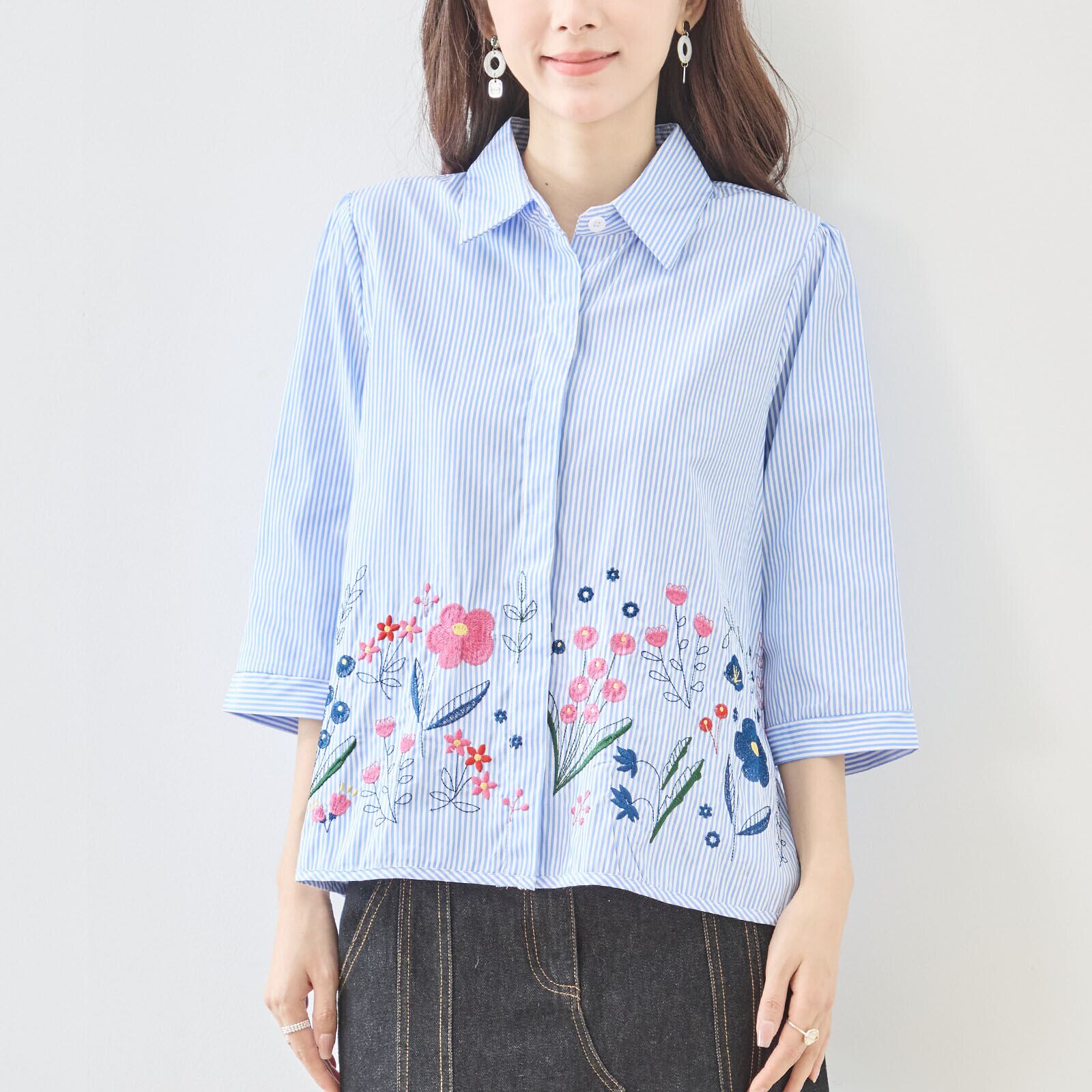 [Design]細かなストライプ柄にボタニカルモチーフの刺繍を組み合わせたフェミニンなブラウス。カラフルな花刺繍が裾に広がり、ナチュラルで優しい印象を演出します。ベーシックなシャツカラーとゆったりとしたシルエットで着回しやすく、デイリーコーデに程よい華やかさをプラス。柄違いカラーを同じページで展開し、それぞれ違った表情を楽しめるデザインです。