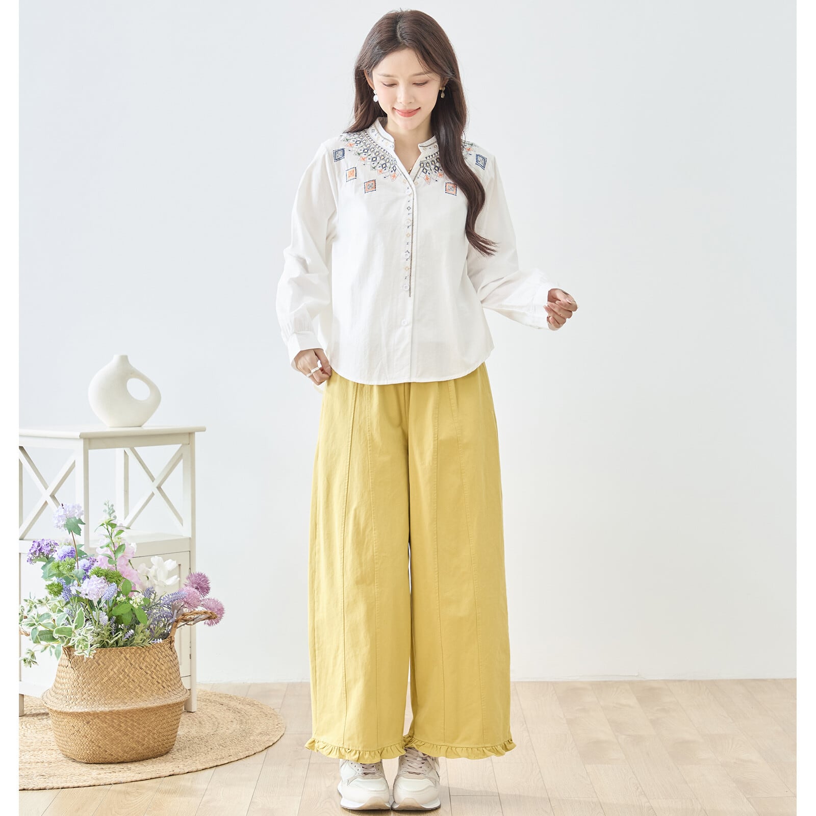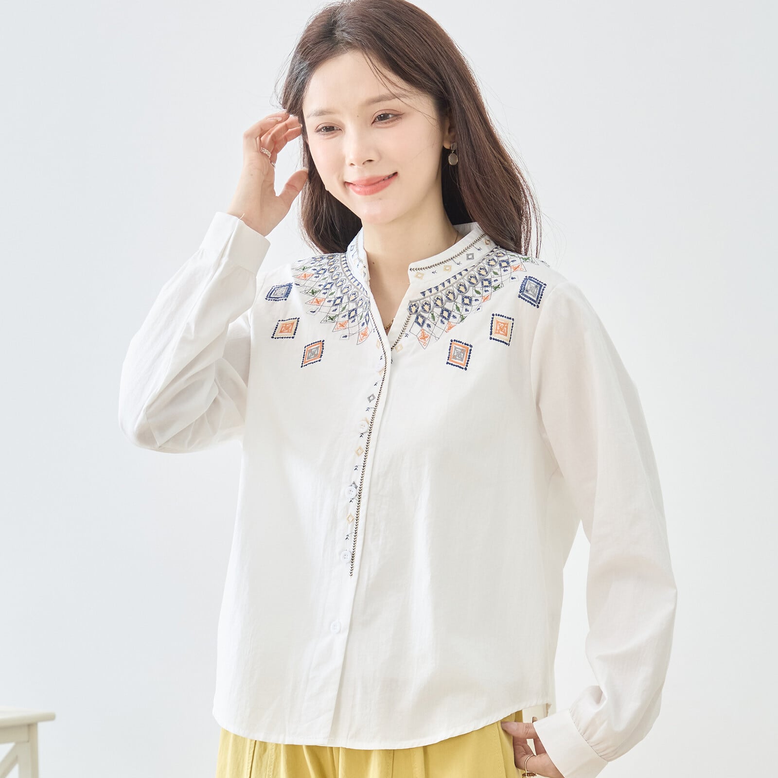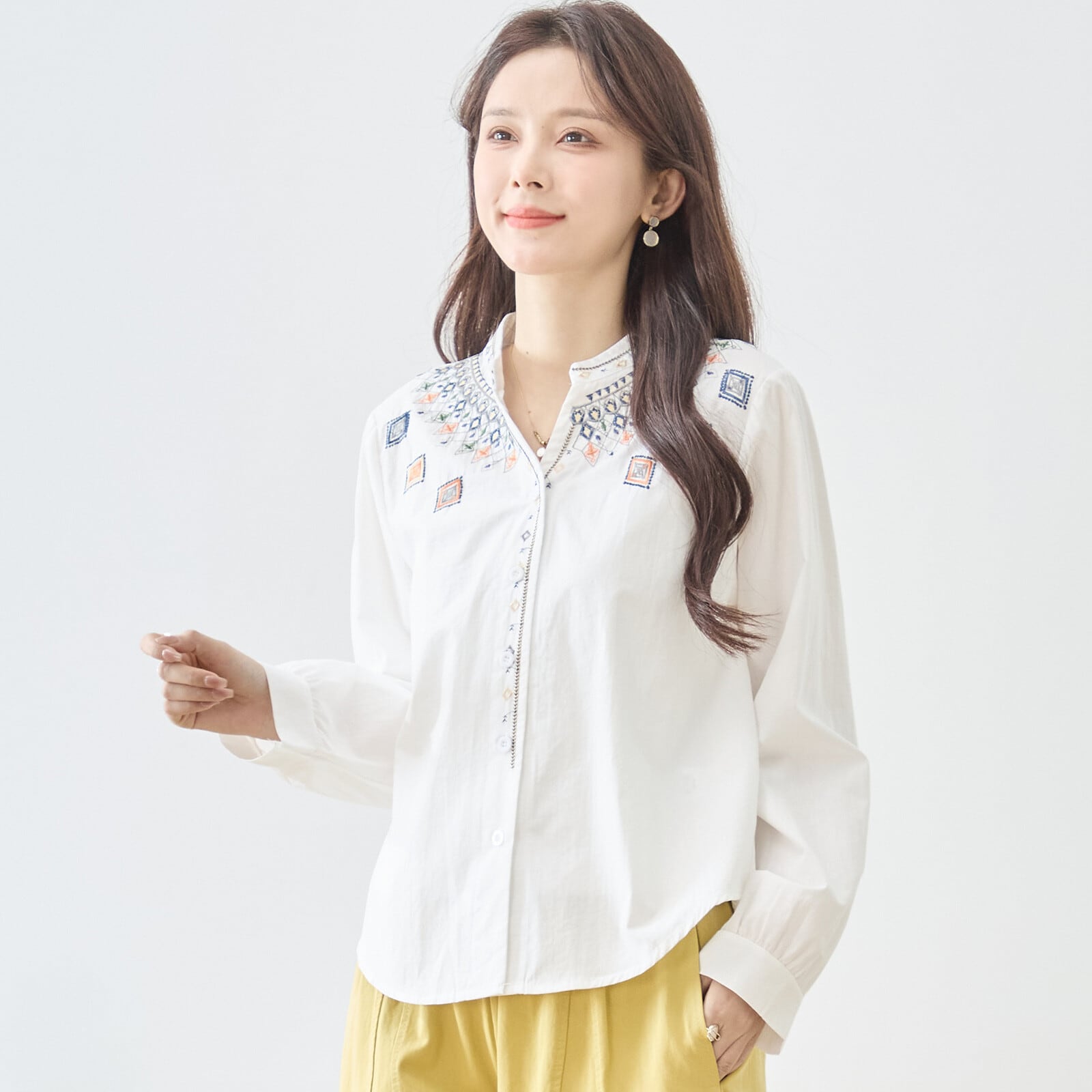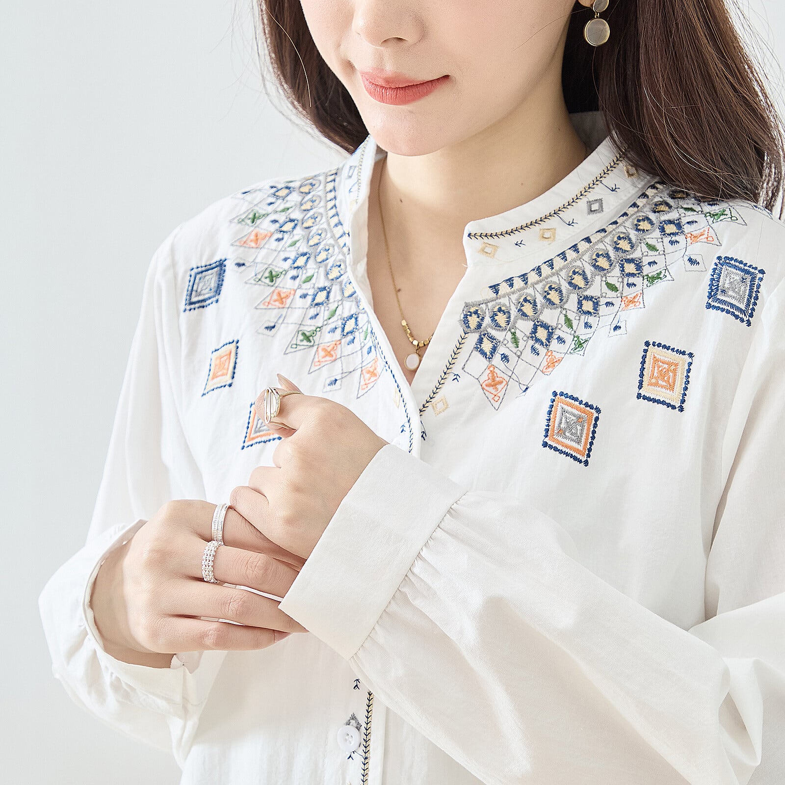 胸元から肩にかけて施された幾何学モチーフの刺繍が華やかなアクセントになるバンドカラーブラウス。繊細な配色刺繍が顔まわりを明るく見せ、シンプルなシルエットに上品な存在感をプラスします。前開き仕様で羽織りとしても活躍し、程よくゆとりのあるラインと前後差ヘムが軽やかな印象を演出。きれいめにもカジュアルにも合わせやすい一枚です。